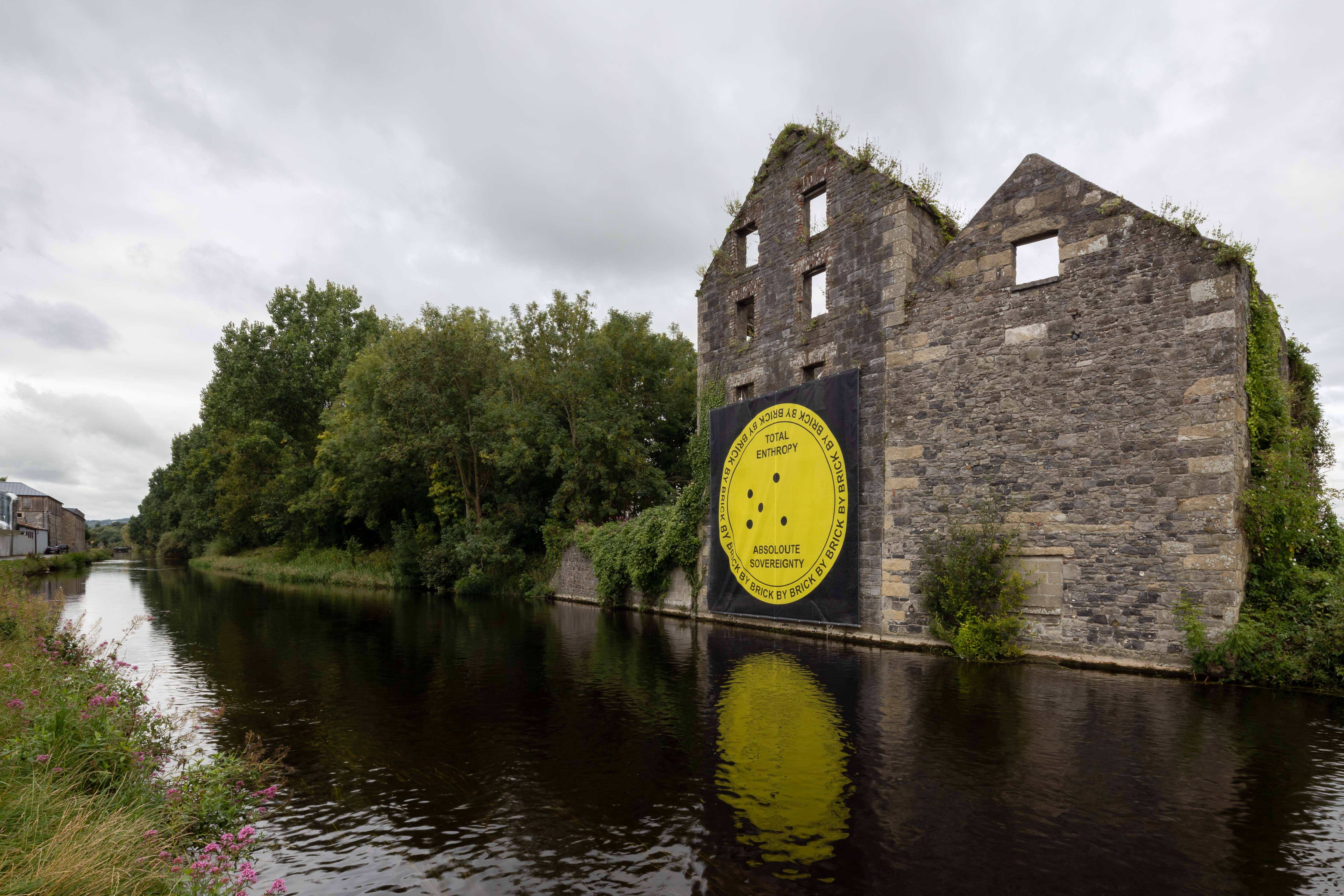 Site specific sculpture, Colour print on PVC scaffolding mesh, 20ft x 20ft, partially obfuscating Rudkins Mill, Muine Bheag, Co. Carlow.